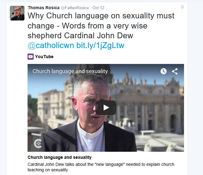 The Catechism refers to the acts undertaken by those suffering from same-sex attraction as being of "grave depravity." Cardinal Dew, speaks of language in the interview and Father Rosica states in his Tweet, that the Church's "language on sexuality must change." It seems then that one of the words to be changed must be "depravity." Well, what else does one call fisting, slurping, analingus, coprophilia, felching, along with the more routine acts of sucking and anal insertion if not actions of great depravity which can result in serious medical conditions including early death in this life and eternal damnation in the next.